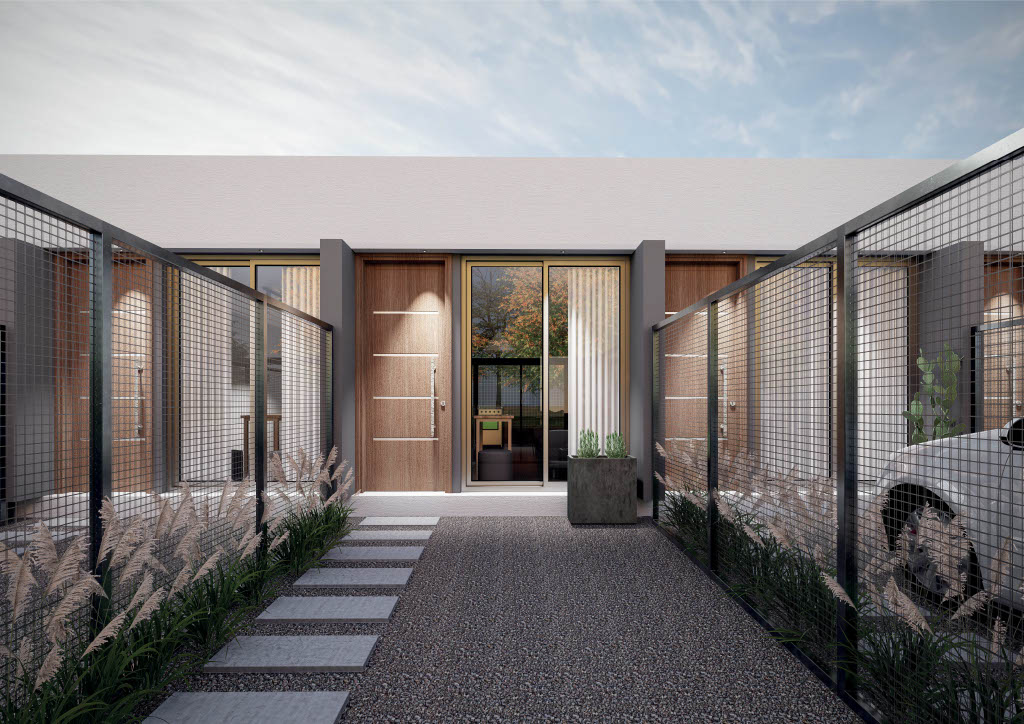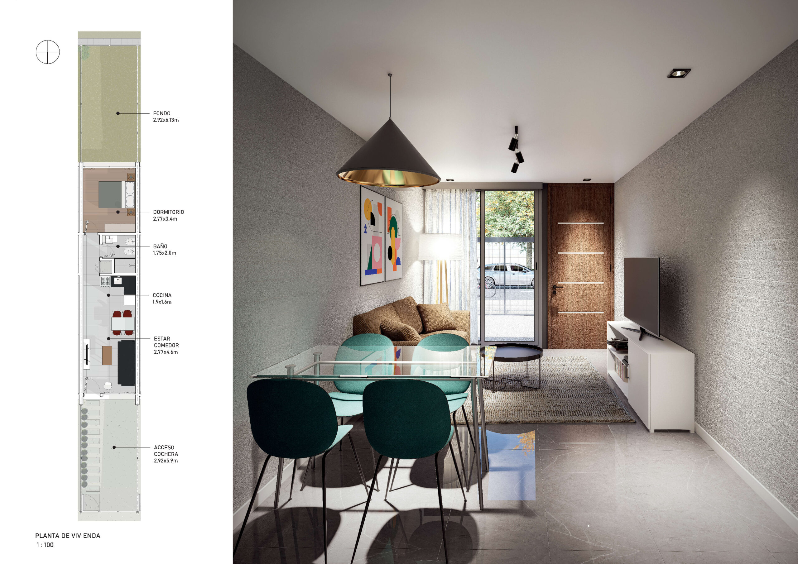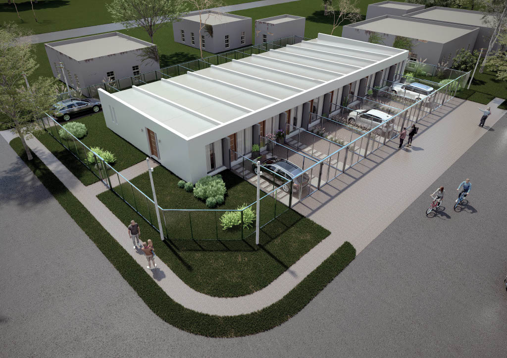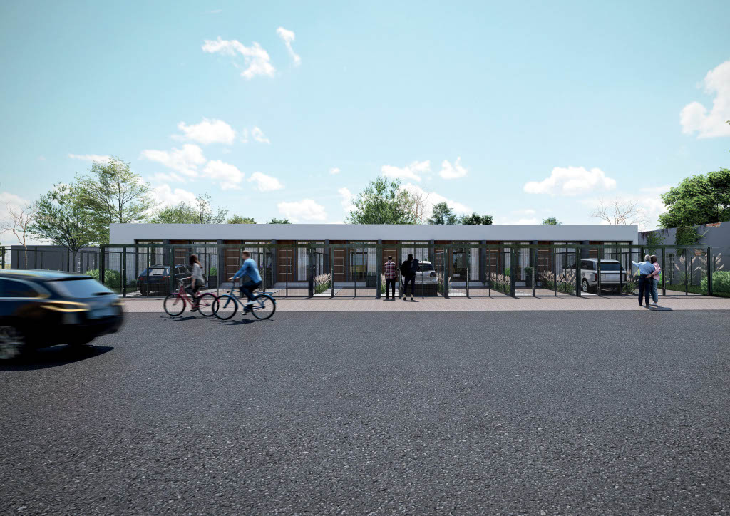 Cada casa consta de un dormitorio, living cocina comedor, baño, cochera y fondo.
